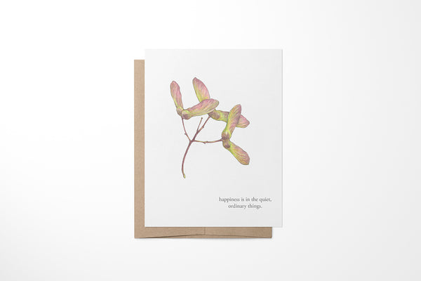 This greeting card features our maple seeds watercolor painting by Heather S Vitticore and a quote by Virginia Wolf (noted on back of the card).